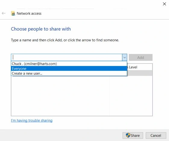 Then choose the people to share the folder – you can choose Everyone to allow all network users, or select other users. Then click Share.