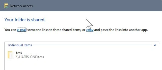 Make a note of the location (for example \\HARTS-ONE\tess\) – this is the name of the server and folder that will be seen by other PCs on the same network. Your server or PC will have a different name.